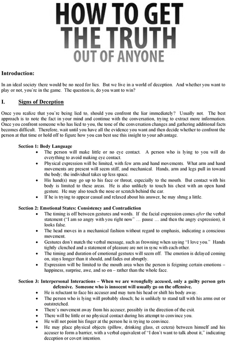 Learn how to get the truth from anyone and never be lied to again. Learn the signs of deception, how to detect treachery or fraud and gather information to help you obtain the truth.