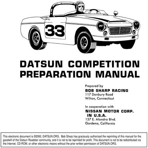 Datsun Competition Preparation workshop Manual download now!!here is a complete service/repair manual for Datsun Competition Preparation. It contains detailed instructions and step by step diagrams for all workshop procedures.