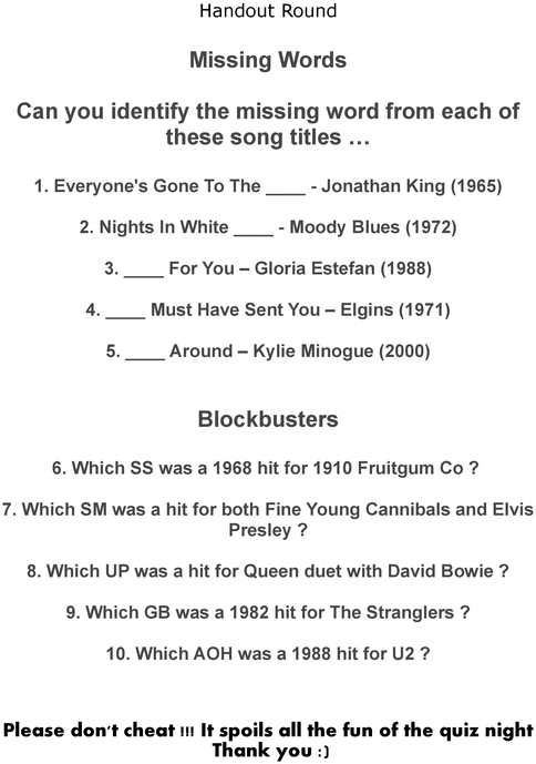 (Question 27 is a song from a film for 3 points and question 30 is a song I play in reverse ... None of the songs are included with this quiz, as it would breach copyright. You can play them yourself if you have them, or choose an alternative 10 songs of your choice)