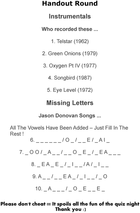 (Question 27 is a song from a film for 3 points and question 30 is a song I play in reverse ... None of the songs are included with this quiz, as it would breach copyright. You can play them yourself if you have them, or choose an alternative 10 songs of your choice)