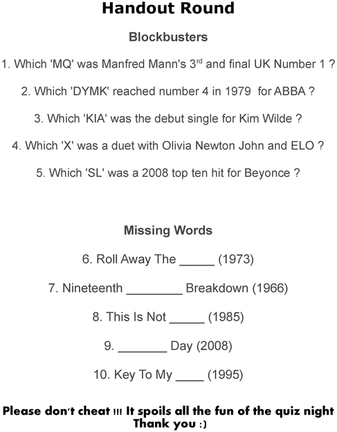 (Question 27 is a song from a film for 3 points and question 30 is a song I play in reverse ... None of the songs are included with this quiz, as it would breach copyright. You can play them yourself if you have them, or choose an alternative 10 songs of your choice)