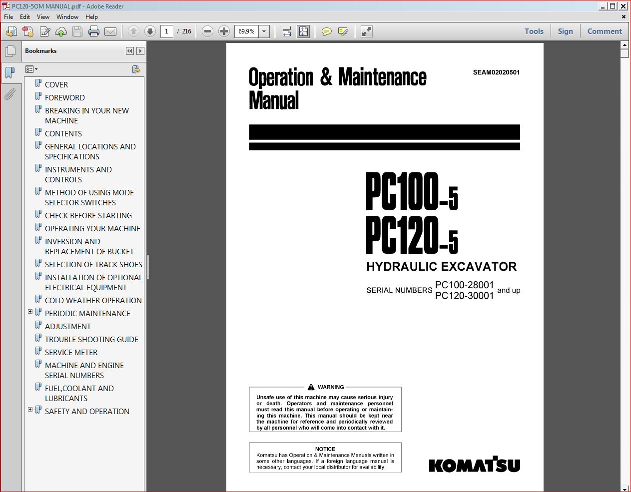 Komatsu PC100-5,PC120-5 operation and maintenance manual.