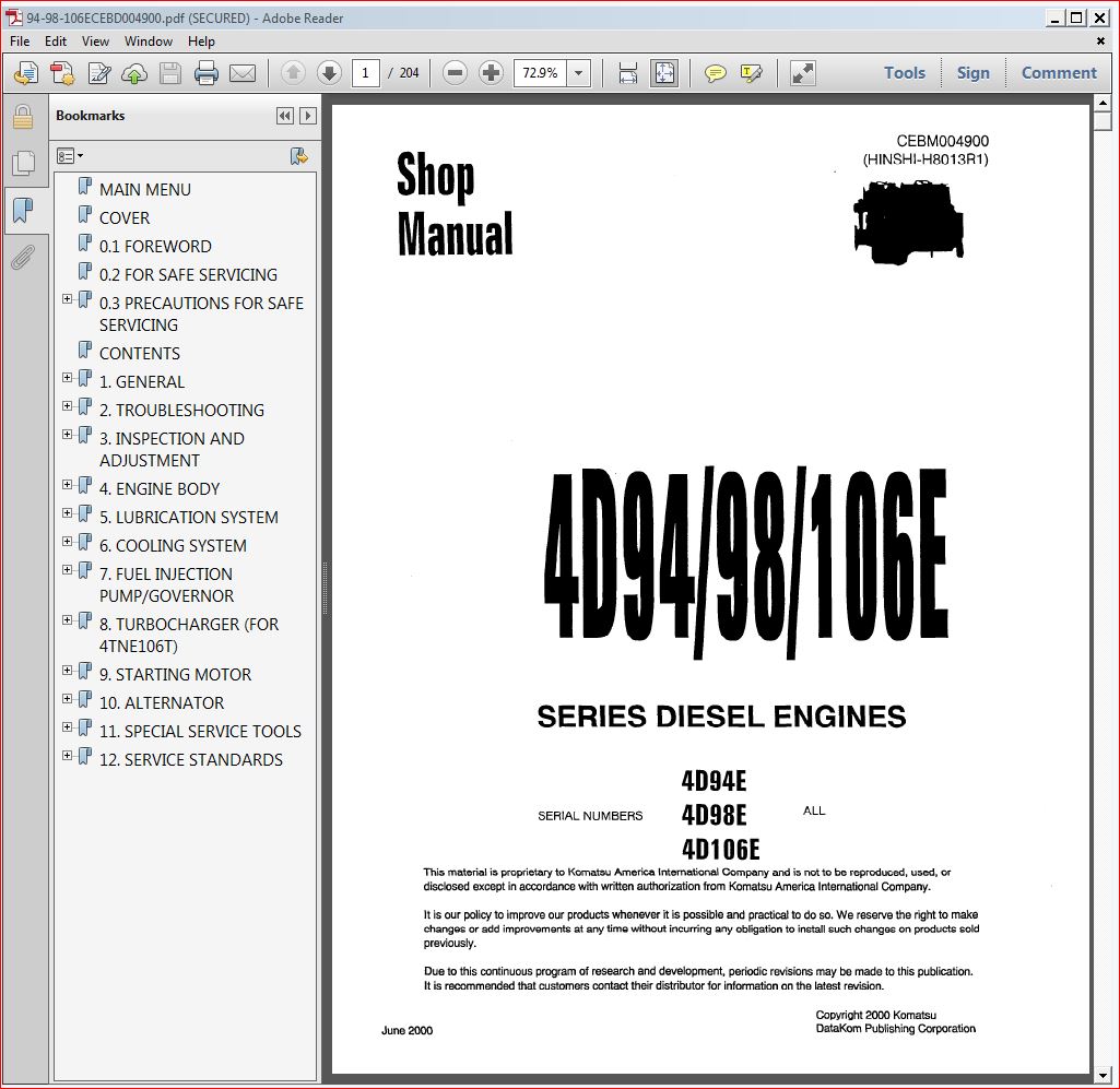 Komatsu 4D94,98,106E engine shop manual. This is a high quality manual, 204 pages. This manual covers following models.