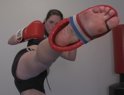 Cute young athlete Lulu loves to practice her kickboxing even in the heat of summer weather. So she trains wearing a sports bra and shorts, aggressively pummeling her human punching bag's midsection over and over. She really wants to knock him out! This clip features fantastic kicks, stunning tramples, and plenty of worship of Lulu's most dangerous weapons. We feel that this will be one of your favorite clips EVER!