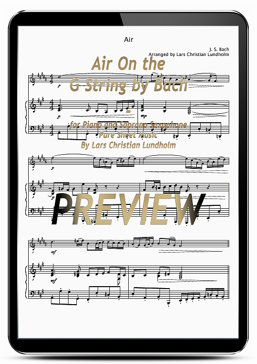 Pure Sheet Music Ebook; Air On the G String by Bach; Piano and Soprano Saxophone; Johann Sebastian Bach; Baroque; 1717; Orchestra Suite by Bach; Movement, Classics; James Bond; Film Music; Funeral, Wedding; Easy; German; Germany; Slow; Score and 1 Part; BWV 1068, Orchestral Suite Number 3 Movement 2, Bach‘s Air; Lars Christian Lundholm; sheet music; arrangement; pdf; download; music ebook; Baroque sheet music for Piano and Soprano Saxophone; Easy level sheet music for Piano and Soprano Saxophone; Slow tempo sheet music for Piano and Soprano Saxophone; Piano and Soprano Saxophone sheet music from the Decade of Years 1710 to 1719; Piano and Soprano Saxophone sheet music from the 18th Century - Years 1701 to 1800; Piano and Soprano Saxophone sheet music composed by Johann Sebastian Bach