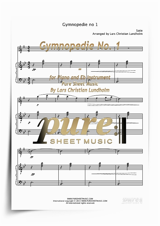 Gymnopedie No. 1; Piano and Eb Instrument; Erik Satie; Impressionistic; 1888; Gymnopedies by Satie; Sad; Film Music; Elegant; Waltz; Easy; French; France; Slow; Score and 1 Part; Trois Gymnopedies, Lent et douloureux; Lars Christian Lundholm; sheet music; arrangement; pdf; download; music ebook; Impressionistic sheet music for Piano and Eb Instrument; Easy level sheet music for Piano and Eb Instrument; Slow tempo sheet music for Piano and Eb Instrument; Piano and Eb Instrument sheet music from the Decade of Years 1880 to 1889; Piano and Eb Instrument sheet music from the 19th Century - Years 1801 to 1900; Piano and Eb Instrument sheet music composed by Erik Satie