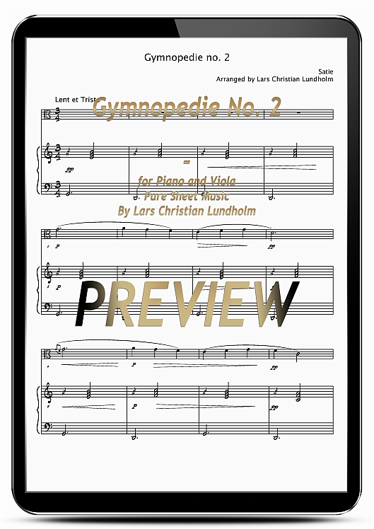Pure Sheet Music Ebook; Gymnopedie No. 2; Piano and Viola; Erik Satie; Impressionistic; 1888; Gymnopedies by Satie; Sad; Film Music; Elegant; Waltz; Easy; French; France; Slow; Score and 1 Part; Trois Gymnopedies, Lent et triste; Lars Christian Lundholm; sheet music; arrangement; pdf; download; music ebook; Impressionistic sheet music for Piano and Viola; Easy level sheet music for Piano and Viola; Slow tempo sheet music for Piano and Viola; Piano and Viola sheet music from the Decade of Years 1880 to 1889; Piano and Viola sheet music from the 19th Century - Years 1801 to 1900; Piano and Viola sheet music composed by Erik Satie