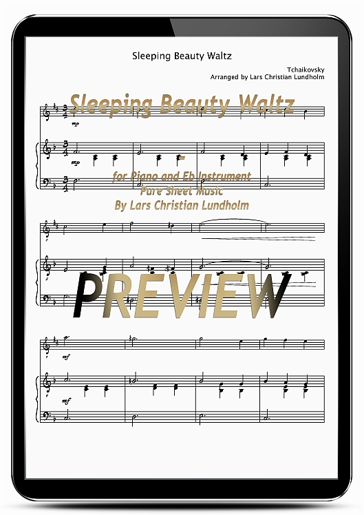 Pure Sheet Music Ebook; Sleeping Beauty Waltz; Piano and Eb Instrument; Peter Ilyich Tchaikovsky; Romantic; 1890; Ballet; Dance; Classics; Elegant; The Sleeping Beauty; Medium; Russian ру?сский язы?к; Russia Россия; Medium; Score and 1 Part; Spyashchaya krasavitsa, La belle au bois dormant, Dornr?schen, Спящая красавица; Lars Christian Lundholm; sheet music; arrangement; pdf; download; music ebook; Romantic sheet music for Piano and Eb Instrument; Medium level sheet music for Piano and Eb Instrument; Medium tempo sheet music for Piano and Eb Instrument; Piano and Eb Instrument sheet music from the Decade of Years 1890 to 1899; Piano and Eb Instrument sheet music from the 19th Century - Years 1801 to 1900; Piano and Eb Instrument sheet music composed by Peter Ilyich Tchaikovsky