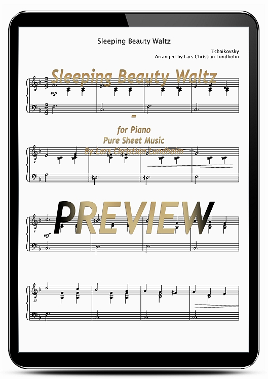 Pure Sheet Music Ebook; Sleeping Beauty Waltz; Piano; Peter Ilyich Tchaikovsky; Romantic; 1890; Ballet; Dance; Classics; Elegant; The Sleeping Beauty; Medium; Russian ру?сский язы?к; Russia Россия; Medium; Solo Score; Spyashchaya krasavitsa, La belle au bois dormant, Dornr?schen, Спящая красавица; Lars Christian Lundholm; sheet music; arrangement; pdf; download; music ebook; Romantic sheet music for Piano; Medium level sheet music for Piano; Medium tempo sheet music for Piano; Piano sheet music from the Decade of Years 1890 to 1899; Piano sheet music from the 19th Century - Years 1801 to 1900; Piano sheet music composed by Peter Ilyich Tchaikovsky
