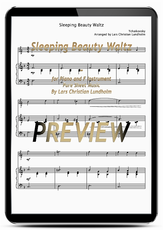 Pure Sheet Music Ebook; Sleeping Beauty Waltz; Piano and F Instrument; Peter Ilyich Tchaikovsky; Romantic; 1890; Ballet; Dance; Classics; Elegant; The Sleeping Beauty; Medium; Russian ру?сский язы?к; Russia Россия; Medium; Score and 1 Part; Spyashchaya krasavitsa, La belle au bois dormant, Dornr?schen, Спящая красавица; Lars Christian Lundholm; sheet music; arrangement; pdf; download; music ebook; Romantic sheet music for Piano and F Instrument; Medium level sheet music for Piano and F Instrument; Medium tempo sheet music for Piano and F Instrument; Piano and F Instrument sheet music from the Decade of Years 1890 to 1899; Piano and F Instrument sheet music from the 19th Century - Years 1801 to 1900; Piano and F Instrument sheet music composed by Peter Ilyich Tchaikovsky