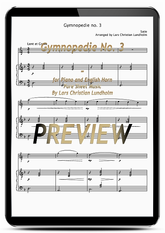 Pure Sheet Music Ebook; Gymnopedie No. 3; Piano and English Horn; Erik Satie; Impressionistic; 1888; Gymnopedies by Satie; Sad; Film Music; Elegant; Waltz; Easy; French; France; Slow; Score and 1 Part; Trois Gymnopedies, Lent et grave; Lars Christian Lundholm; sheet music; arrangement; pdf; download; music ebook; Impressionistic sheet music for Piano and English Horn; Easy level sheet music for Piano and English Horn; Slow tempo sheet music for Piano and English Horn; Piano and English Horn sheet music from the Decade of Years 1880 to 1889; Piano and English Horn sheet music from the 19th Century - Years 1801 to 1900; Piano and English Horn sheet music composed by Erik Satie