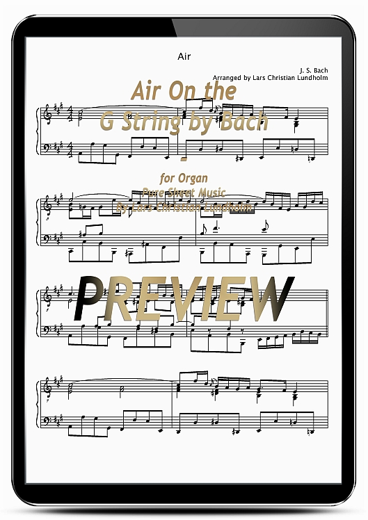 Pure Sheet Music Ebook; Air On the G String by Bach; Organ; Johann Sebastian Bach; Baroque; 1717; Orchestra Suite by Bach; James Bond; Movement; Classics; Wedding, Funeral, Film Music; Easy; German; Germany; Slow; Solo Score; BWV 1068, Orchestral Suite Number 3 Movement 2, Bach‘s Air; Lars Christian Lundholm; sheet music; arrangement; pdf; download; music ebook; Baroque sheet music for Organ; Easy level sheet music for Organ; Slow tempo sheet music for Organ; Organ sheet music from the Decade of Years 1710 to 1719; Organ sheet music from the 18th Century - Years 1701 to 1800; Organ sheet music composed by Johann Sebastian Bach
