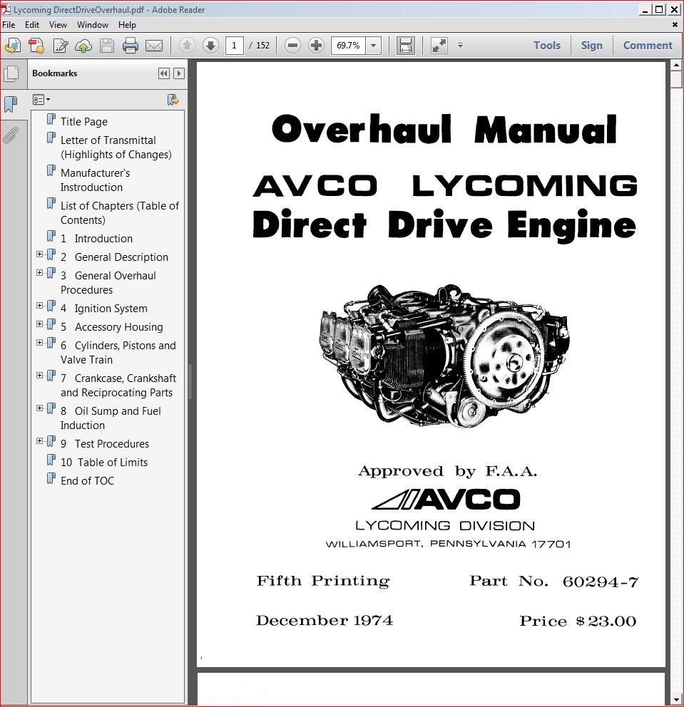 Avco Lycoming direct drive engine. 5th printing,1974 part no 60294-7.