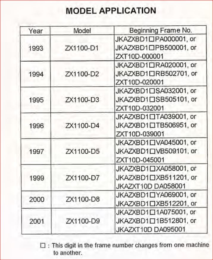 ZX1100-D1 thru to ZX1100-D9. Check preview for full vin number ranges.