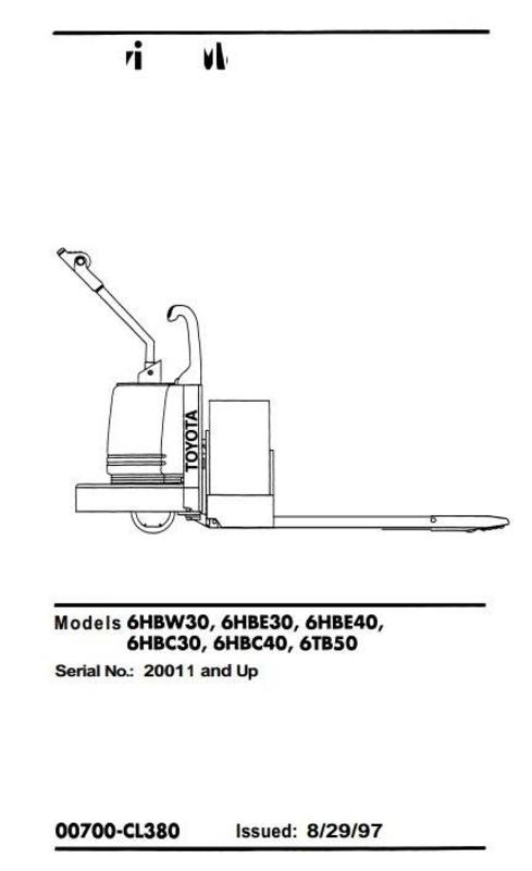 Toyota Electric Pallet Truck 6HBC30, 6HBC40, 6HBE30, 6HBE40, 6HBW30, 6TB50 SN 20011-23999 Workshop Service Manual