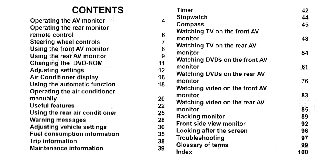 This Nissan Elgrand AV Monitor Owners Manual in English is a 100% English translation of the official Japanese illustrated AV Monitor Owners manual, over 100 pages of detailed information about the Elgrand AV system, Air Con, DVD player, Car Wings and remote controls. Everything is covered and fully illustrated so if you want to know how to use the Climate control, Car Wings, the built in Sat Nav, The remote controls and every dash related button that is in Japanese then this manual is for you. A perfect companion to the English Owners Manual or the Workshop Manuals also available.