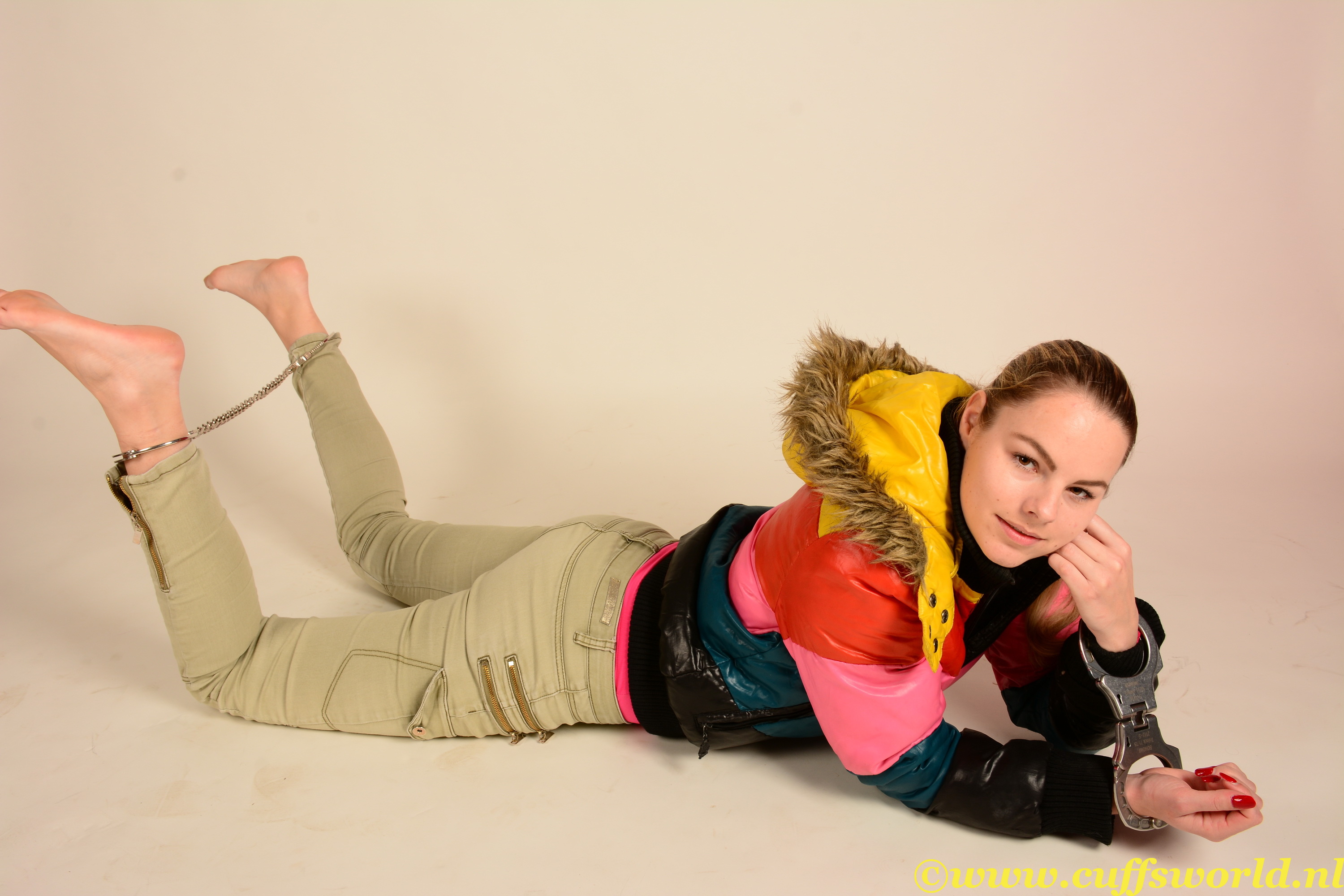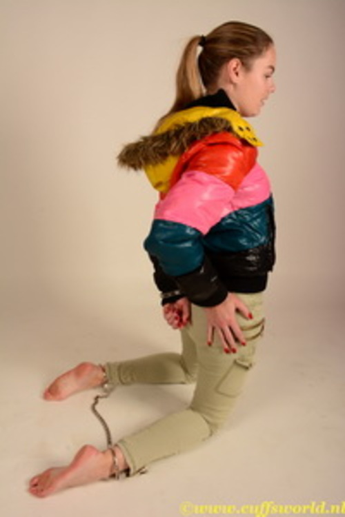 Our blond model Christy was invited again for some picture sets with the handcuffs. At this first set we stay inside the studio with the white background and let her put on a shiny multicolored jacket. For her wrists we have choosen the German hinged BONOWI handcuffs to handcuffed as wel in the front as on the back. Her leggs are restraint with the American Peerless M-703 leggirons.