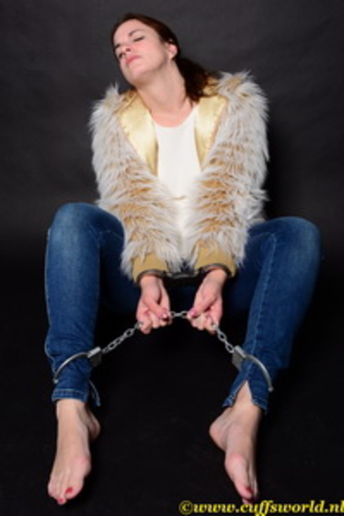 For this set Centy was wearing a hooded furry jacket and tight jeans, but no shoes. Yes, she was barefoot and we used a set of Englisch TCH handcuffs and American AHC legirons. Looks how she enjoy the furry jacket and to be restraint with those two pieces off jewels.