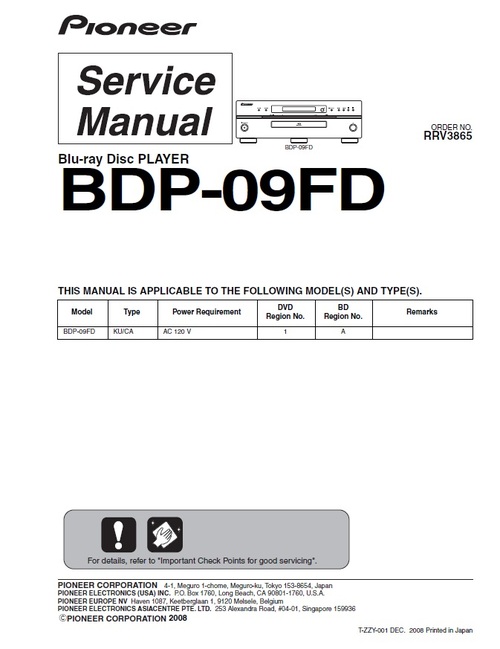 Pioneer BDP-09FD (AC 120V) Blu Ray player Service Manual