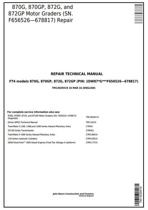 John Deere 870G,870GP,872G,872GP (SN.F656526-678817)Motor Graders Service Repair Manual (TM13029X19)