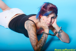 3 sets of Black hinged handcuffs are the toys we used to restraint our model Ingrid in several positions. hands in the front, at the back and even in hogtie position.