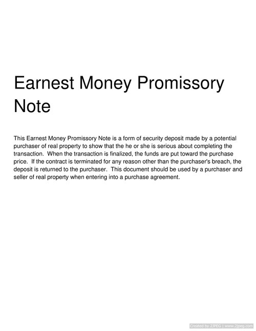 This Earnest Money Promissory Note is a form of security deposit made by a potential purchaser of real property to show that the he or she is serious about completing the transaction. When the transaction is finalized, the funds are put toward the purchase price. If the contract is terminated for any reason other than the purchasers breach, the deposit is returned to the purchaser. This document should be used by a purchaser and seller of real property when entering into a purchase agreement.