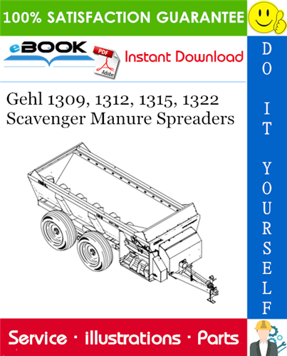 This is the COMPLETE Parts Manual for the Gehl 1309, 1312, 1315, 1322 Scavenger Manure Spreaders. Designed for the repair shops and individuals when ordering parts for their Gehl 1309, 1312, 1315, 1322 Scavenger Manure Spreaders. This Manual describes and illustrates assemblies, subassemblies, and detail parts needed for service replacement. it Covers every part of your Gehl 1309, 1312, 1315, 1322 Scavenger Manure Spreaders inside and out. Tons of pictures and diagrams at your fingertips!