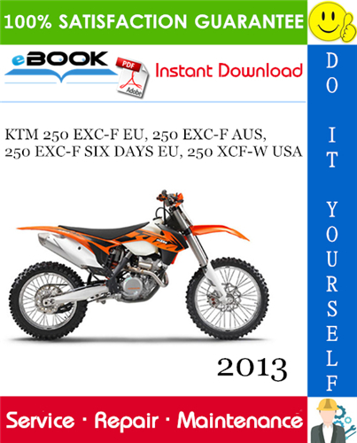 This is the COMPLETE Service Repair Manual for the KTM 250 EXC-F EU, 250 EXC-F AUS, 250 EXC-F SIX DAYS EU, 250 XCF-W USA Motorcycle. Production model years 2013. It Covers complete tear down and rebuild, pictures and part diagrams, torque specs, maintenance, troubleshooting, etc.