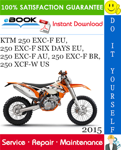 This is the COMPLETE Service Repair Manual for the KTM 250 EXC-F EU, 250 EXC-F SIX DAYS EU, 250 EXC-F AU, 250 EXC-F BR, 250 XCF-W US Motorcycle. Production model years 2015. It Covers complete tear down and rebuild, pictures and part diagrams, torque specs, maintenance, troubleshooting, etc.