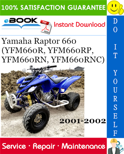 This is the COMPLETE Service Repair Manual for the Yamaha Raptor 660 (YFM660R, YFM660RP, YFM660RN, YFM660RNC) ATV. Production model years 2001 2002. It Covers complete tear down and rebuild, pictures and part diagrams, torque specs, maintenance, troubleshooting, etc.