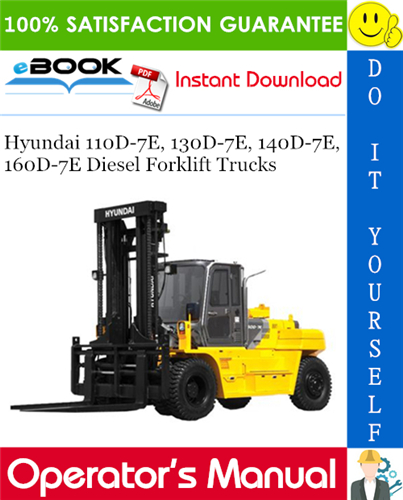 This is the COMPLETE Operators Manual for the Hyundai 110D-7E, 130D-7E, 140D-7E, 160D-7E Diesel Forklift Trucks.