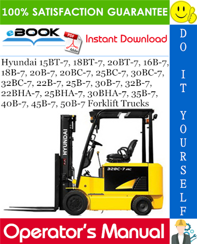 This is the COMPLETE Operators Manual for the Hyundai 15BT-7, 18BT-7, 20BT-7, 16B-7, 18B-7, 20B-7, 20BC-7, 25BC-7, 30BC-7, 32BC-7, 22B-7, 25B-7, 30B-7, 32B-7, 22BHA-7, 25BHA-7, 30BHA-7, 35B-7, 40B-7, 45B-7, 50B-7 Forklift Trucks.