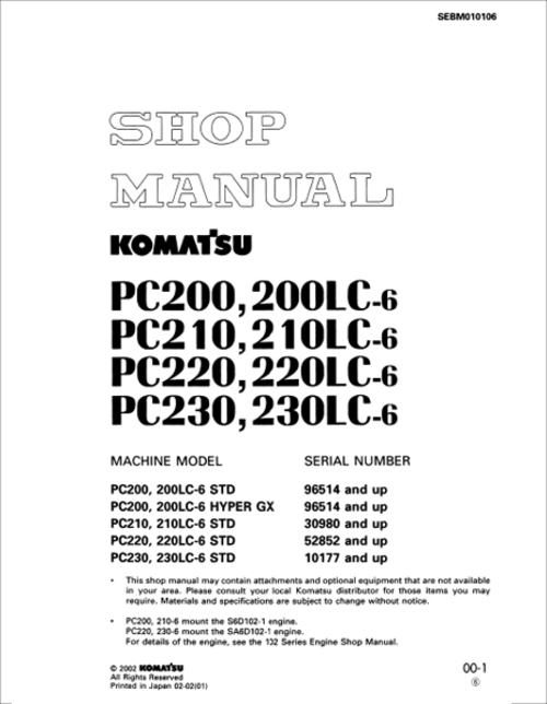 In this Komatsu PC230 PC230LC-6 STD service manual you will find: