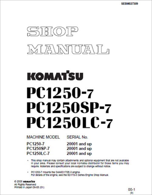 Komatsu PC1250-7 PC1250LC-7 Service Manual Serial 20001 and up
