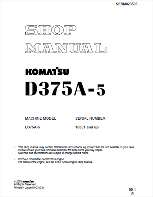 Komatsu D375A 5 Service Manual Serial 18001 and up