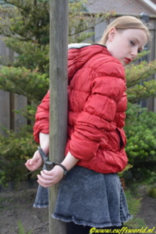 We restrained our model Rosa Black on the pole in the garden with a set of black handcuffs
