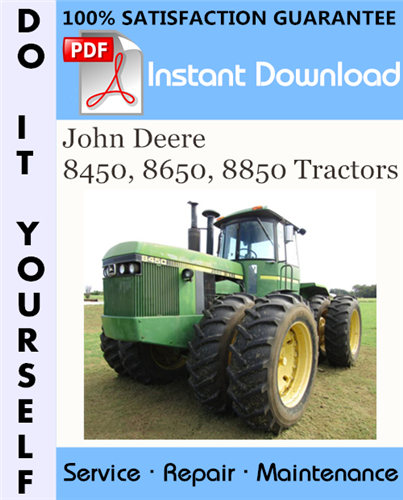 This is the COMPLETE factory Technical Manual for the John Deere 8450, 8650, 8850 Tractors. This manual is very detailed and contains information and data to this model. has specs, diagrams, and actual real photo illustrations, and schemes. which give you complete step by step operations on repair, assembly, disassembly, Diagnosing, servicing, technical maintenance & troubleshooting procedures for your machine.