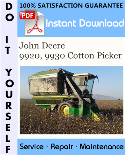 This is the COMPLETE factory Technical Manual for the John Deere 9920, 9930 Cotton Picker. This manual is very detailed and contains information and data to this model. has specs, diagrams, and actual real photo illustrations, and schemes. which give you complete step by step operations on repair, assembly, disassembly, Diagnosing, servicing, technical maintenance & troubleshooting procedures for your machine.