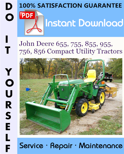 This is the COMPLETE factory Technical Manual for the John Deere 655, 755, 855, 955, 756, 856 Compact Utility Tractors. This manual is very detailed and contains information and data to this model. has specs, diagrams, and actual real photo illustrations, and schemes. which give you complete step by step operations on repair, assembly, disassembly, Diagnosing, servicing, technical maintenance & troubleshooting procedures for your machine.