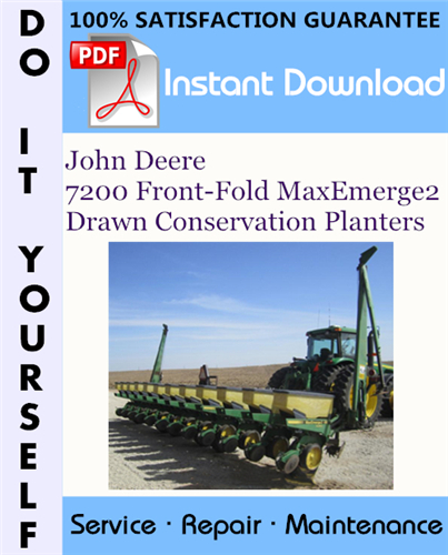 This is the COMPLETE factory Technical Manual for the John Deere 7200 Front-Fold MaxEmerge2 Drawn Conservation Planters. This manual is very detailed and contains information and data to this model. has specs, diagrams, and actual real photo illustrations, and schemes. which give you complete step by step operations on repair, assembly, disassembly, Diagnosing, servicing, technical maintenance & troubleshooting procedures for your machine.