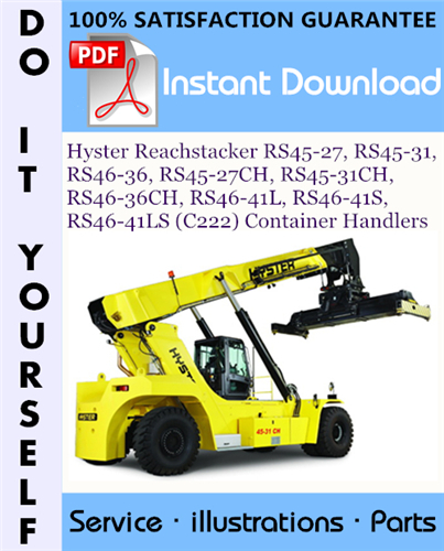 This is the COMPLETE Parts Manual for the Hyster Reachstacker RS45-27, RS45-31, RS46-36, RS45-27CH, RS45-31CH, RS46-36CH, RS46-41L, RS46-41S, RS46-41LS (C222) Container Handlers. This manual contains all the information you need to properly replace parts on your Hyster Reachstacker RS45-27, RS45-31, RS46-36, RS45-27CH, RS45-31CH, RS46-36CH, RS46-41L, RS46-41S, RS46-41LS (C222) Container Handlers. Filled with illustrations and all part numbers. with step-by-step instruction & highly detailed exploded pictures & diagrams to show you how to complete the required job correctly & efficiently. Its the same type of Manual that your local Dealer/Mechanic would use.