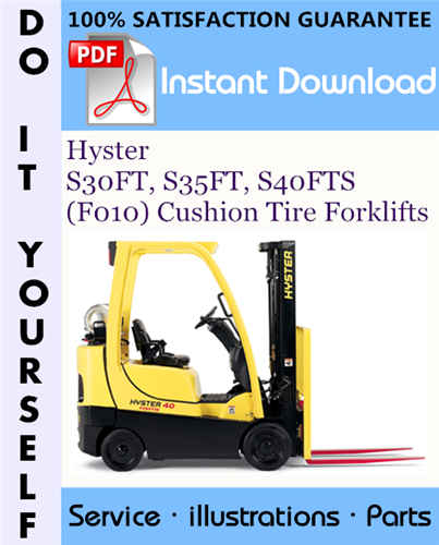 This is the COMPLETE Parts Manual for the Hyster S30FT, S35FT, S40FTS (F010) Cushion Tire Forklifts. This manual contains all the information you need to properly replace parts on your Hyster S30FT, S35FT, S40FTS (F010) Cushion Tire Forklifts. Filled with illustrations and all part numbers. with step-by-step instruction & highly detailed exploded pictures & diagrams to show you how to complete the required job correctly & efficiently. Its the same type of Manual that your local Dealer/Mechanic would use.