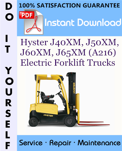 This is the COMPLETE factory Service Repair Workshop Manual for the Hyster J40XM, J50XM, J60XM, J65XM (A216) Electric Forklift Trucks. This manual is very detailed and contains information and data to this model. has specs, diagrams, and actual real photo illustrations, and schemes. which give you complete step by step operations on repair, assembly, disassembly, Diagnosing, servicing, technical maintenance & troubleshooting procedures for your machine.