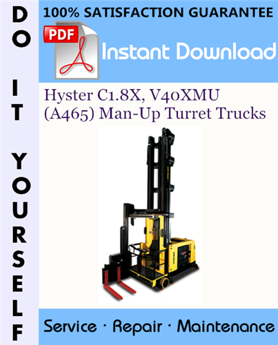 This is the COMPLETE factory Service Repair Workshop Manual for the Hyster C1.8X, V40XMU (A465) Man-Up Turret Trucks. This manual is very detailed and contains information and data to this model. has specs, diagrams, and actual real photo illustrations, and schemes. which give you complete step by step operations on repair, assembly, disassembly, Diagnosing, servicing, technical maintenance & troubleshooting procedures for your machine.
