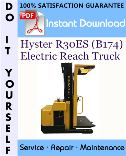 This is the COMPLETE factory Service Repair Workshop Manual for the Hyster R30ES (B174) Electric Reach Truck. This manual is very detailed and contains information and data to this model. has specs, diagrams, and actual real photo illustrations, and schemes. which give you complete step by step operations on repair, assembly, disassembly, Diagnosing, servicing, technical maintenance & troubleshooting procedures for your machine.