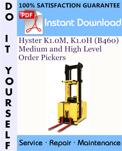 This is the COMPLETE factory Service Repair Workshop Manual for the Hyster K1.0M, K1.0H (B460) Medium and High Level Order Pickers. This manual is very detailed and contains information and data to this model. has specs, diagrams, and actual real photo illustrations, and schemes. which give you complete step by step operations on repair, assembly, disassembly, Diagnosing, servicing, technical maintenance & troubleshooting procedures for your machine.