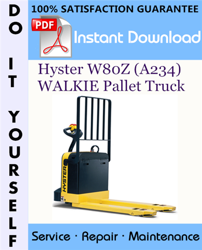 This is the COMPLETE factory Service Repair Workshop Manual for the Hyster W80Z (A234) WALKIE Pallet Truck. This manual is very detailed and contains information and data to this model. has specs, diagrams, and actual real photo illustrations, and schemes. which give you complete step by step operations on repair, assembly, disassembly, Diagnosing, servicing, technical maintenance & troubleshooting procedures for your machine.