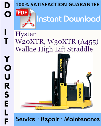This is the COMPLETE factory Service Repair Workshop Manual for the Hyster W20XTR, W30XTR (A455) Walkie High Lift Straddle. This manual is very detailed and contains information and data to this model. has specs, diagrams, and actual real photo illustrations, and schemes. which give you complete step by step operations on repair, assembly, disassembly, Diagnosing, servicing, technical maintenance & troubleshooting procedures for your machine.