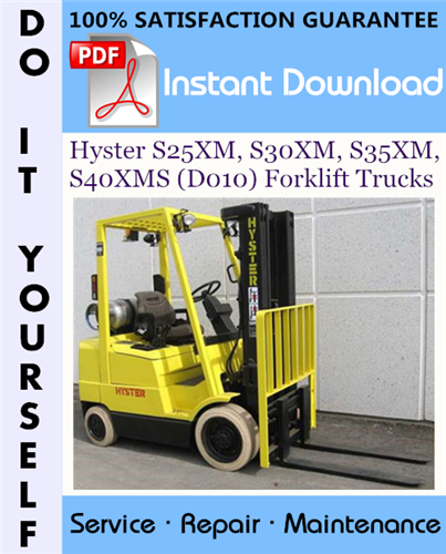 This is the COMPLETE factory Service Repair Workshop Manual for the Hyster S25XM, S30XM, S35XM, S40XMS (D010) Forklift Trucks. This manual is very detailed and contains information and data to this model. has specs, diagrams, and actual real photo illustrations, and schemes. which give you complete step by step operations on repair, assembly, disassembly, Diagnosing, servicing, technical maintenance & troubleshooting procedures for your machine.