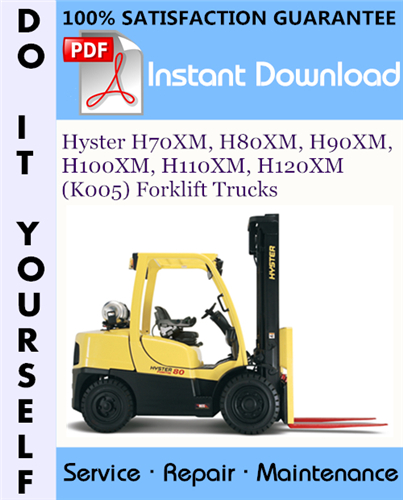 This is the COMPLETE factory Service Repair Workshop Manual for the Hyster H70XM, H80XM, H90XM, H100XM, H110XM, H120XM (K005) Forklift Trucks. This manual is very detailed and contains information and data to this model. has specs, diagrams, and actual real photo illustrations, and schemes. which give you complete step by step operations on repair, assembly, disassembly, Diagnosing, servicing, technical maintenance & troubleshooting procedures for your machine.